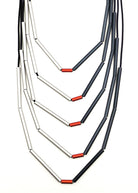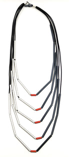 44" long, 5 strand necklace w/ skinny long brushed silver, matte black and burnt orange aluminum tubes. Easy toggle closure