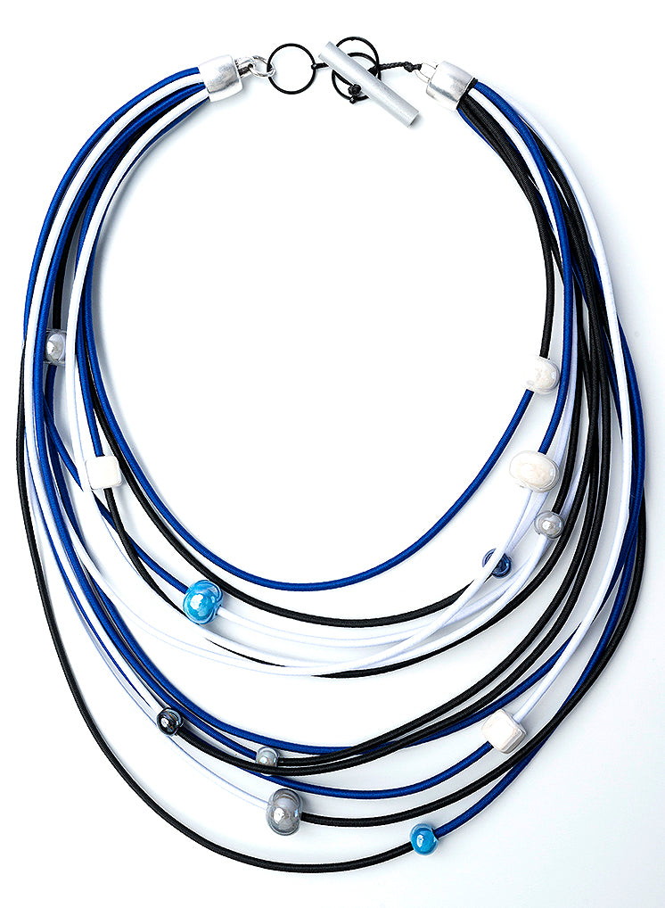 We love this multi-strand necklace with ceramic ball accents! 28" outside diameter, lightweight white, silver and black cords with shades of blue and white ceramic shapes; adjustable toggle closure