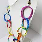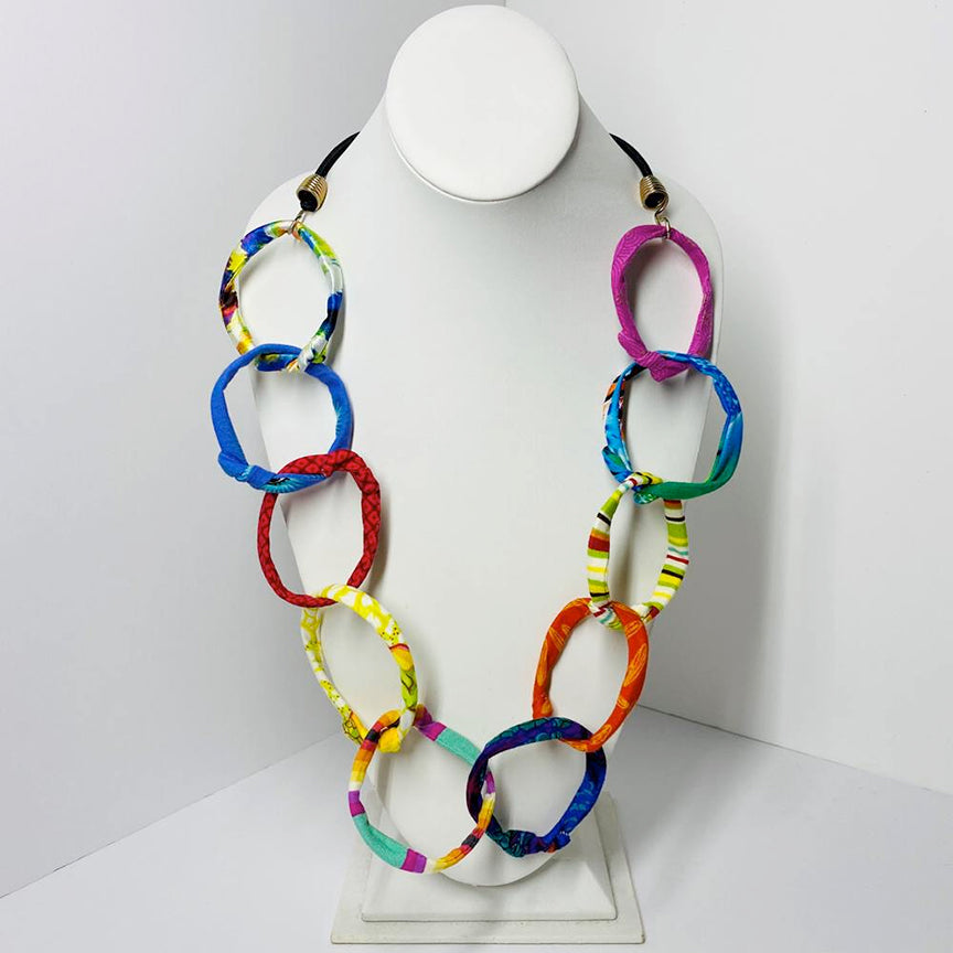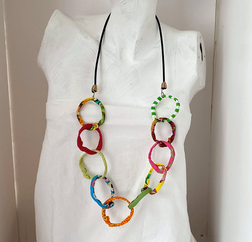 A large chain of 10 Ficklesticks linked together on our house-made black bungee cord. This necklace is light-weight and has a lot of movement! Larger version of the Small Chain on Bungee. Approximately 22 in. long (44 in. circumference). Machine washable, dry in a lingerie bag.