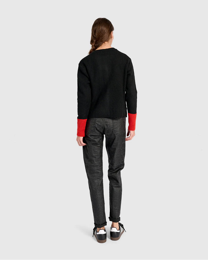 The Blackbird cardigan is a modern classic, offering a sleek cropped shape with softly fuzzy texture. Tailored with a straight silhouette and full-length sleeves, it's finished with colorblock ribbed details and shell buttons for a polished yet playful look. Classic fit from shoulders to hem. One size: 40" bust; 21" length; best for up to size 10. 60% Acrylic + 14% Polyamide + 10% Polyester + 8% Wool; Hand wash cold, lay flat to dry