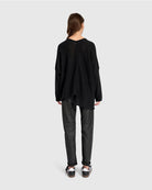With a softly draped shape and asymmetrical rolled hem, the Bliss Slouchy Sweater delivers relaxed structure in a breathable open-knit. The open-knit texture adds dimension, while the bracelet sleeves and asymmetrical hem elevate its relaxed, breathable fit. The black is a staple for effortless layering, it pairs with both wide-leg and slim silhouettes. Loose boxy silhouette from shoulders to hem. One size: best for up to a size 16. A midweight 50% Cotton + 50% Polyester. Hand wash cold, lay flat to dry