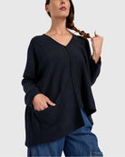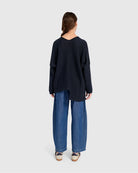 Rendered in deep navy, the Bliss Slouchy Sweater delivers a fluid silhouette with understated edge. The open-knit texture adds dimension, while the bracelet sleeves and asymmetrical hem elevate its relaxed, breathable fit. A staple for effortless layering, it pairs with both wide-leg and slim silhouettes. Loose boxy silhouette from shoulders to hem. One size: best for up to a size 16. A midweight 50% Cotton + 50% Polyester. Hand wash cold, lay flat to dry