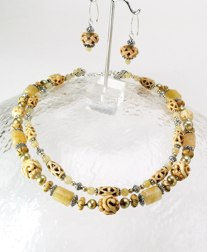 Limited Edition necklace featuring carved bone, yellow jade, pearls, blond onyx and pewter. Silver plated clasp and 4" extender chain. Alice Bailey Designs signature tag.