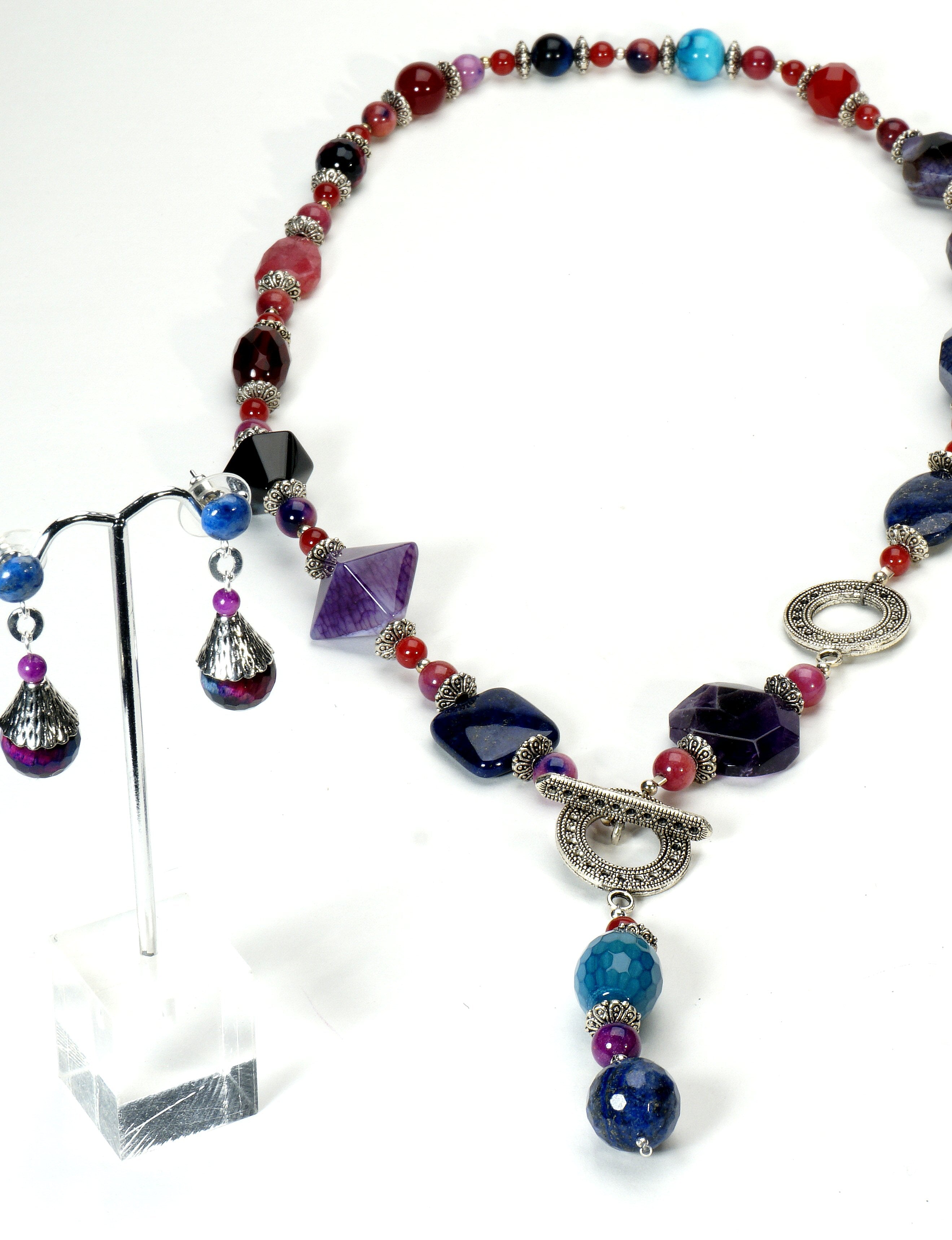 Limited Edition necklace from the Spring & Summer collection. Yellow turquoise, serpentine, zebra agate, red magnesite and turquoise. Four strands with pewter cones, steel chain, silver plated clasp and 4" extender chain. 27" - 31" adjustable length.