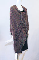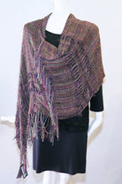 This handwoven infinity wrap is a lovely lightweight combination of hand dyed silk, bamboo, cotton and rayon slub fibers. This manteau wrap has an eyelash yarn that adds a lovely airy and lacey look, with loads of texture and depth in the weaving. Slip it over your head and choose the look you want. One size - plum/multi