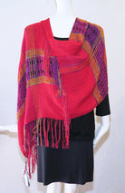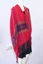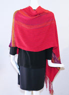 This lightweight manteau infinity wrap is a lovely medium weight combination of bamboo, silk, cotton and rayon slub fibers. Slip it over your head and choose the look you want • One size - red/purple/gold