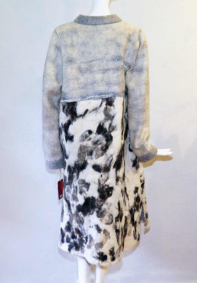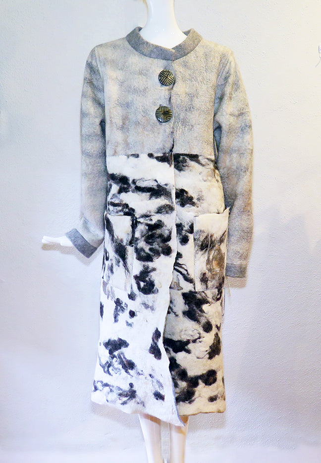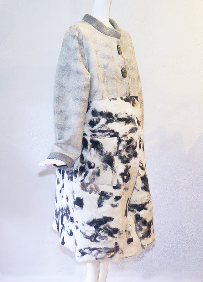 This handmade felted wool coat is constructed of a lovely mix of suri and huacaya alpaca, habotai silk and merino wool. Double button closure and single hidden snap, lined patch pockets, and contrast cuffs and collar. This coat was the grand prize winner at the 2024 MAVWA Wool Festival in Santa Fe. Size M - 40" bust; 42" long; 46" hip width