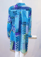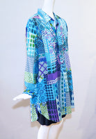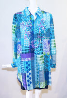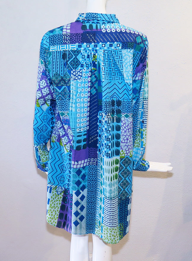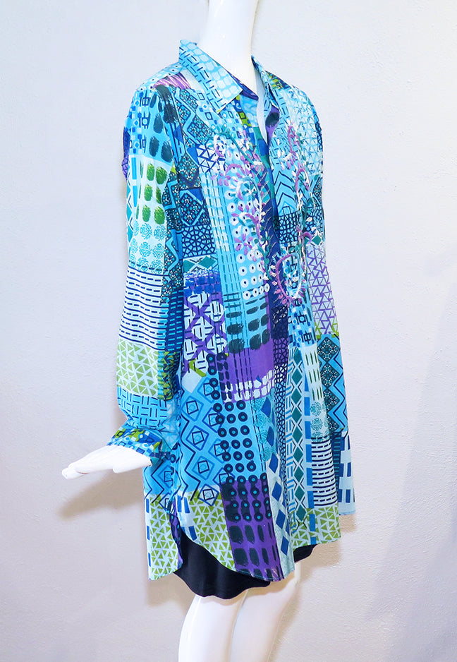 Delightful lightweight embroidered rayon tunic top. Shirt style collar and hem with a V notch front placket, long sleeves with button tabs to roll to 3/4 length, and side seam pockets. S - 42" bust; M - 42" bust; L - 44" bust; XL - 46" bust; 31" front length, slightly longer in the back; hand wash and line dry