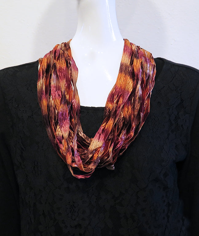 Hand dyed silk ribbon necklaces in vibrant colors from Taos artist, Bella Sue Martin. Just slip it over your head for a lightweight colorful neck adornment and you're ready to go! About 28" long. Makes a great gift!