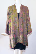 Elegant kimono style jacket in a reversible lightweight rayon fabric. Bracelet length dolman style sleeves and on seam pockets. S/M - 48" bust; L/XL - 54" bust; 28" - 35" long; measured with front lapel closed; size recommendations are for a relaxed fit