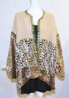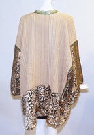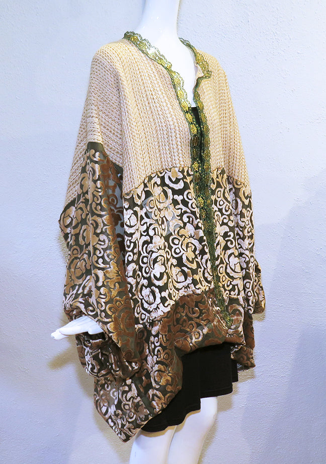 This handmade jacket is understated and elegant. It features Barbara's woven silk and beautiful velvet burnout fabric and trim. Relaxed open front styling with poet blouse style sleeves and longer back panel for a stunning silhouette. One Size: 60" bust; 27" - 34" length