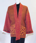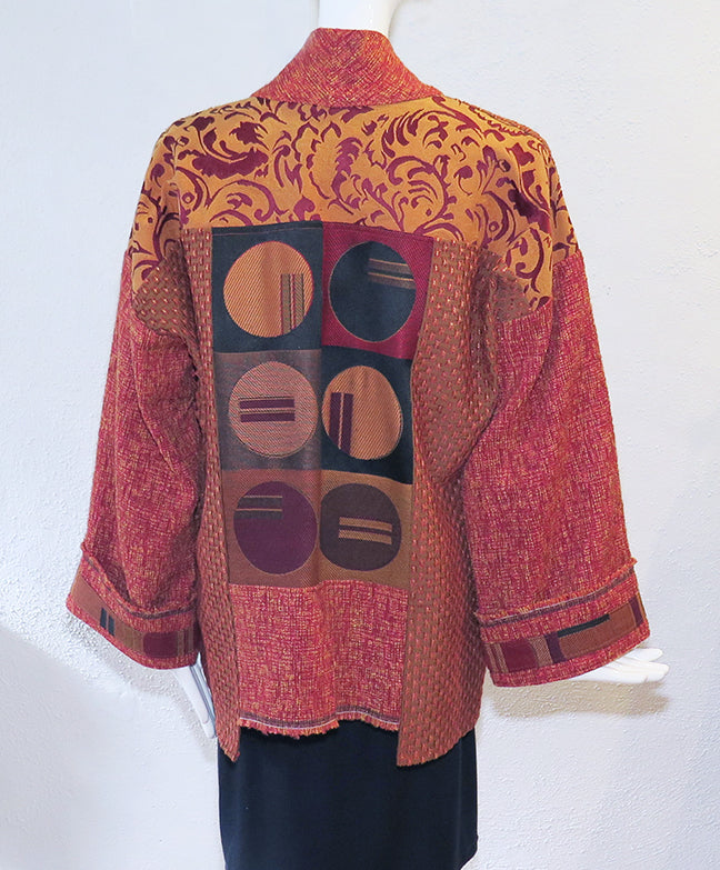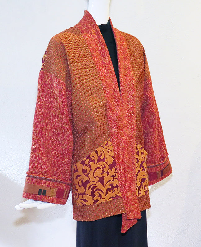 This one-of-a-kind kimono style jacket was thoughtfully created using a mix of medium weight fabrics and features a shawl collar, patch pockets, and dolman style long sleeves. Pumpkin, terracotta and cinnamon color combination. Size M/L: 42" bust; 28" length
