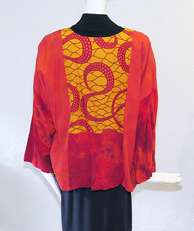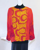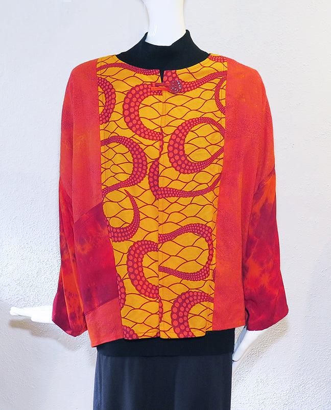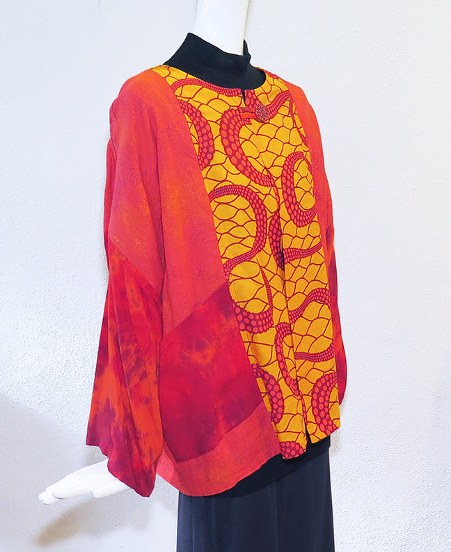 This one-of-a-kind jacket was thoughtfully created using a mix of lightweight fabrics and features a single button closure, 8" back slit, a single patch pocket, and dolman style bracelet length sleeves. Orange/red. Size L: 48" bust; 24" length
