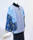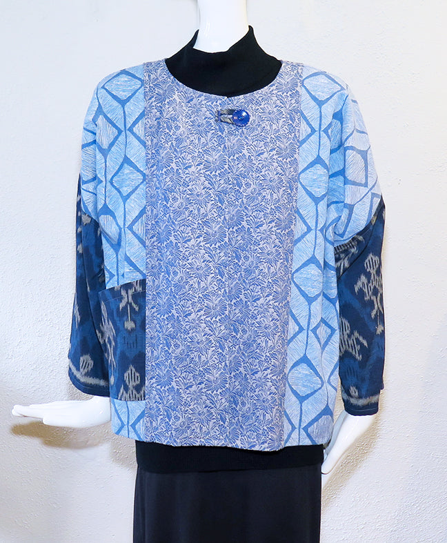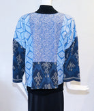 This one-of-a-kind jacket was thoughtfully created using a mix of lightweight fabrics and features a single button closure, 8" back slit, a single patch pocket, and dolman style bracelet length sleeves. Blues. Size M/L: 44" bust; 24" length