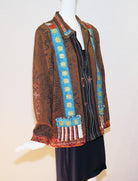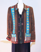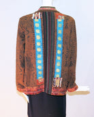 Kat's "Canyon Road" quilted cotton jacket is part of her Altered Eco Collection. This one-of-a-kind jacket is made from upcycled quilted cotton and features a full zip front, with fabric and painted embellishments front and back. Size XS/S - 40" bust; 24" length