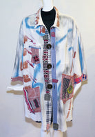 Kathy's "Plein Air Kimono Jacket" is part of her Altered Eco Collection. This one-of-a-kind jacket is made from super soft upcycled cotton and has been painted all over by Kat. It features fun patch pockets, cotton embellishments, kimono style sleeves, vintage button front and relaxed off the shoulder styling. Wear it buttoned up or open as a jacket. Size 3x - 58" bust; 35" length