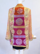 This lovely blouse is 100% silk, with a shirt style collar, long sleeves, and button front. Tunic length. Wear it as a blouse or tunic or open as a jacket. One size - 40" bust; 32" length. Pre-Owned