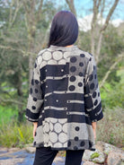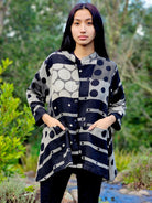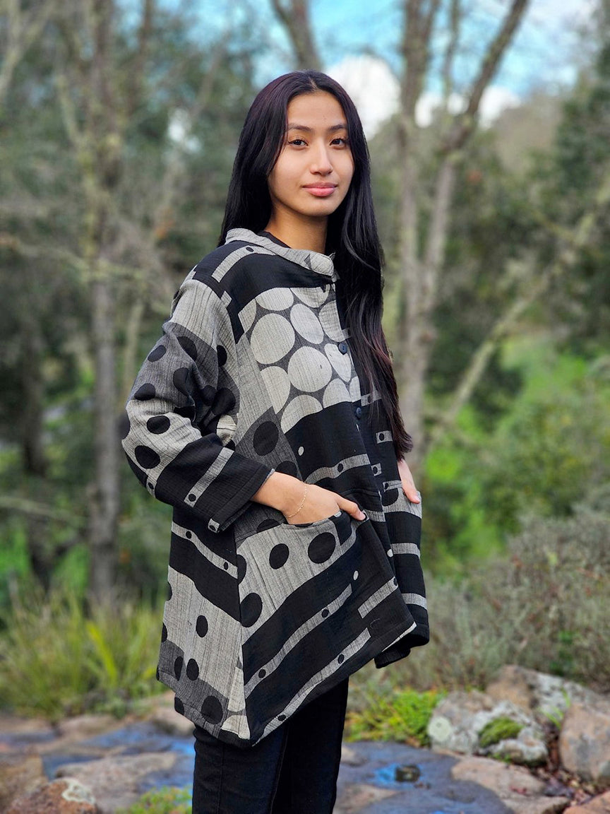 This cotton jacket is a soft and cozy 100% triple gauze cotton and features a mandarin collar, button front, flattering A-line silhouette and front pockets. Size S/M - 42" bust, 27" length; M/L - 46" bust; 30" length
