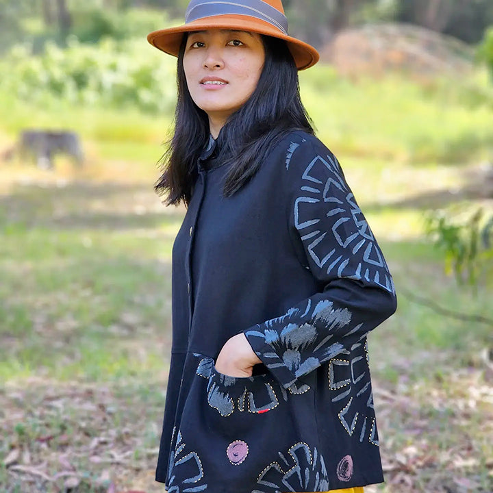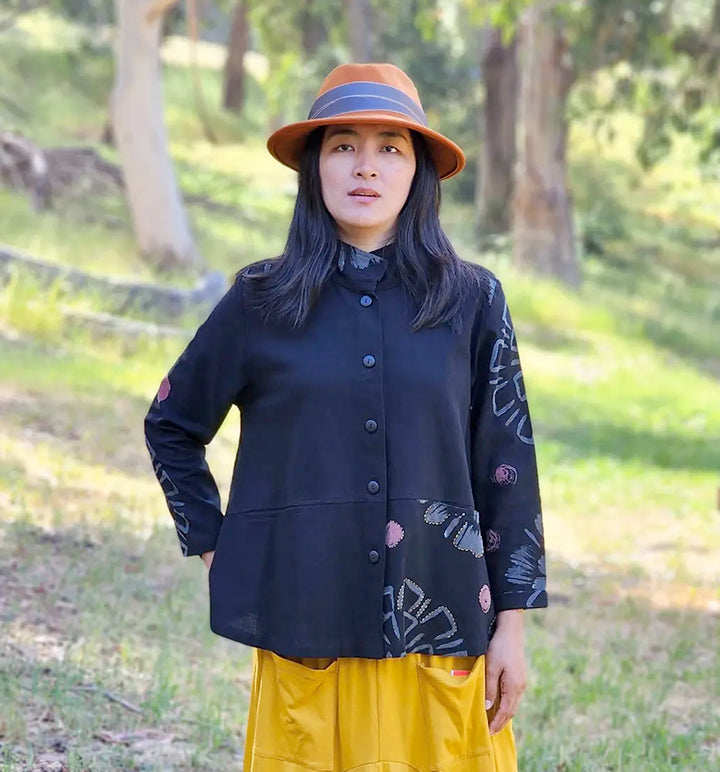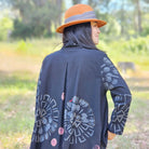 The Yaza Batik Art Floral Jacket is 100% cotton, with hand stitched detail, a lovely back pleat, and front pockets. Hand or machine wash gentle; hang to dry. Size S/M - 44" bust; 26" length; M/L - 48" bust; 28" length