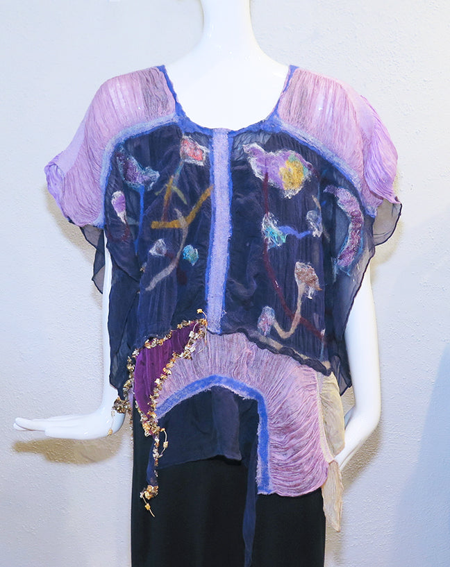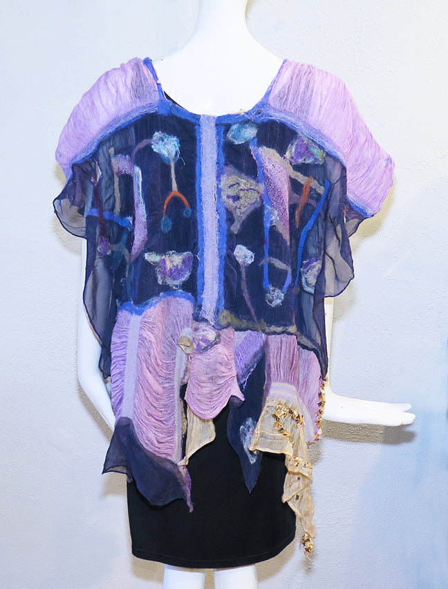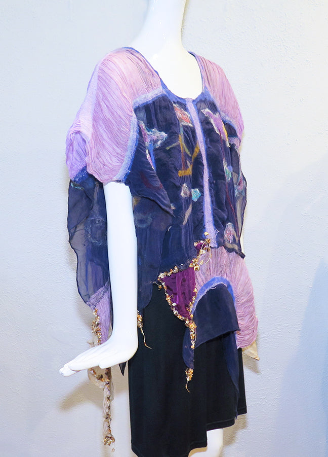 Born in Turkey, Cedide moved to the United States and earned two masters degrees in mathematics before deciding that fashion and textiles were her true passion. She now creates clothing and accessories under her Cdd Silhouettes label. Oclay creates her own textiles by hand, making nuno fabric by combining felt and open weave materials in a complex process that results in stunning multi-textured cloth. She sews this unique medium into striking ponchos, vests, shirts, shawls, scarves and various other one-of-a-kind wearable art pieces.