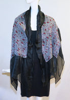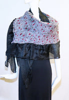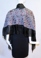This nuno felted shawl is a black shimmery cotton-linen and white silk fabric with greens and reds. Lightweight and elegant with silky ruffle edges all around. Slip it over your shoulders and find the look that suits you! One-of-a-kind. One size: 22-24" wide x 60" long, including the silk edging