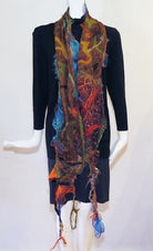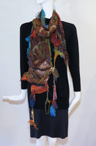 Cedide's Surprise Scarves are so much fun! Nuno felted silk and wool are combined for a beautiful one-of-a-kind wearable art scarf. Whisper light silk and fine merino with mixed trims. Hand wash; line dry. 2" - 9" wide x 92" long