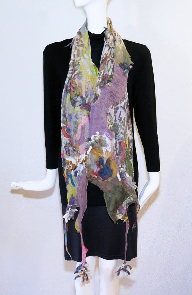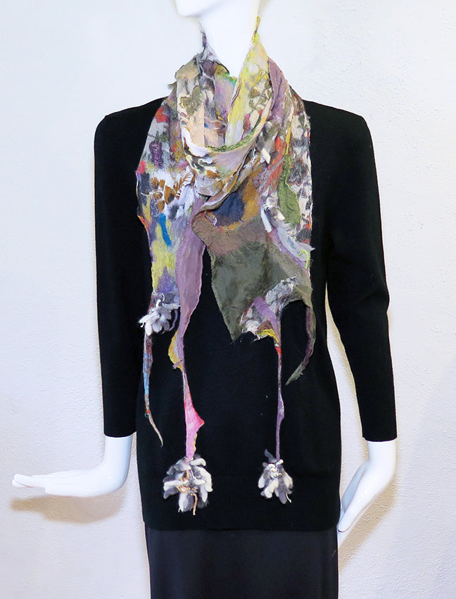 Cedide's Surprise Scarves are so much fun! Nuno felted silk and wool are combined for a beautiful one-of-a-kind wearable art scarf. Whisper light silk and fine merino with mixed trims. Hand wash; line dry. 1" - 9" wide x 80" long