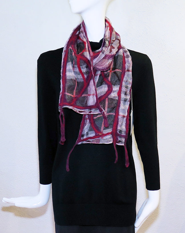 Cedide's Surprise Scarves are so much fun! Nuno felted silk and wool are combined for a beautiful one-of-a-kind wearable art scarf. Whisper light double layer silk and fine merino with mixed trims. Hand wash; line dry. 7" wide x 60" long, including felt fringe