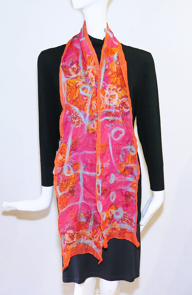 Cedide's Surprise Scarves are so much fun! Nuno felted silk and wool are combined for a beautiful one-of-a-kind wearable art scarf. Whisper light silk and fine merino with mixed trims. Hand wash; line dry. 7" wide x 66" long