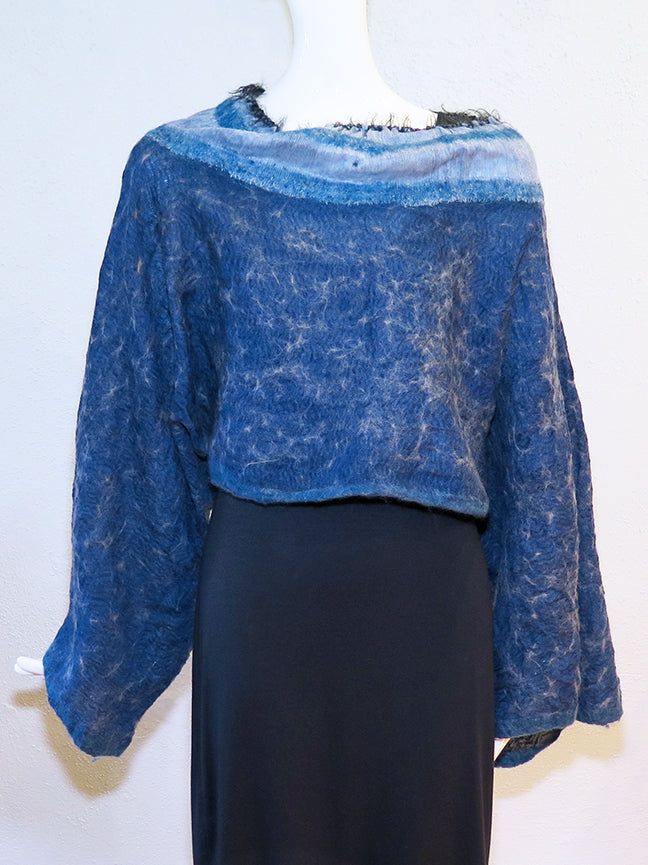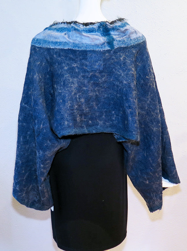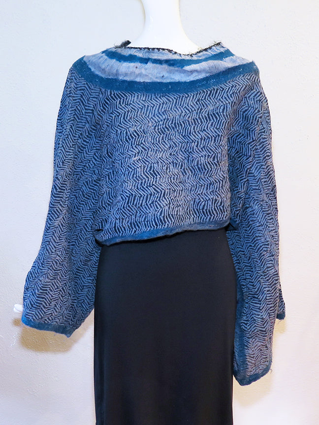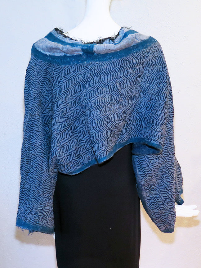 This long sleeve top is navy cotton fabric sandwiched with navy and grey zig-zag print silk and bonded with merino nuno felting. Truly reversible with elegant sleeves and a felted collar. One-of-a-kind; One size: 17" length front/back; 52" side to side