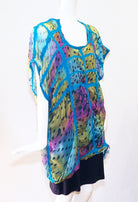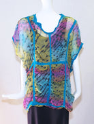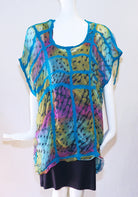 This pretty little top is a fun nuno felted tamarack silk with multi color felted merino accents. One-of-a-kind. One size: 42" bust; 22" length