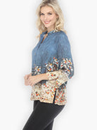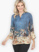 Classic Citron style blouse in our signature Silk Blend featuring an intricate wide floral border on hem and sleeves. Indigo background has a textured pattern creating a watercolor brushed effect. Styled with mandarin collar and 3/4 sleeves with slits. 70% silk/30% rayon blended fabric. Size XS - 38" bust, 24" length; Size M - 42" bust, 25" length. Hand Wash / Dry Flat.