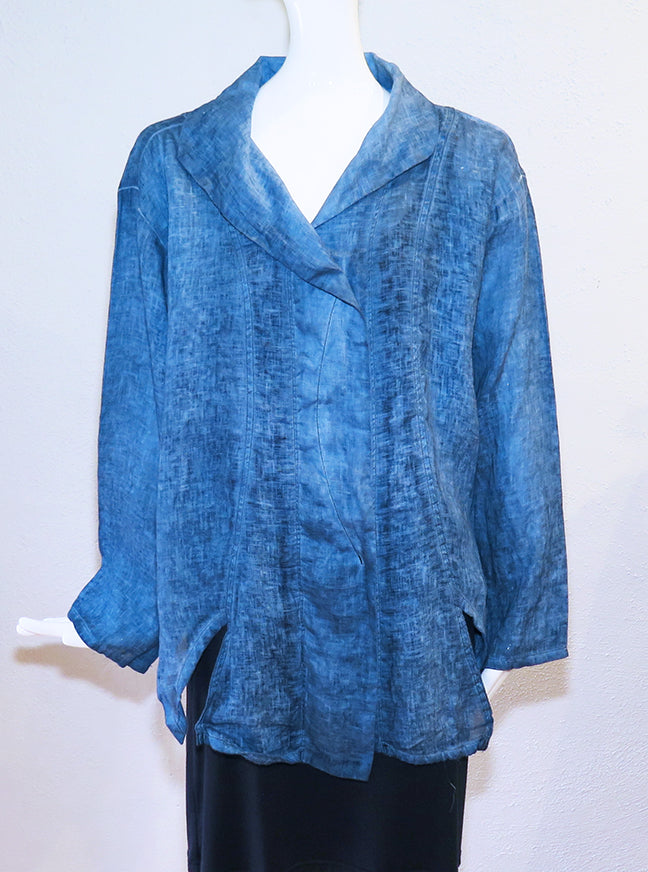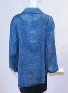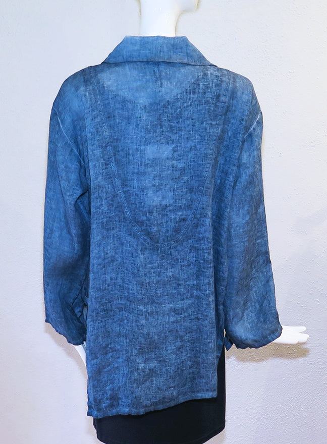 Cynthia Ashby clothing is modern, yet timeless. Natural, yet edgy and effortless. The Muse tunic top is a lovely linen fabric in a garment dyed denim color with a mottled, textured finish. Details include contrast stitching on the front and back, wide collar, notched hem and long sleeves. Size recommendations based on a relaxed fit. Size 0 - 40" bust; 27" length