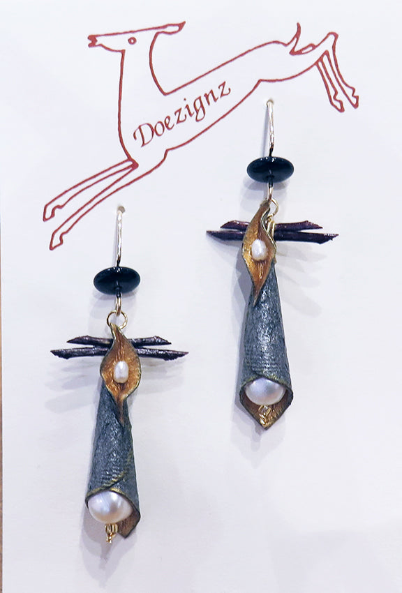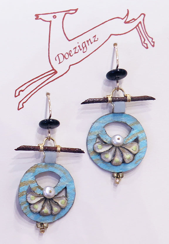 Unique handmade paper, mixed media collage jewelry created by Doe Cross Hayes. Doezignz are wearable art collages with a graceful construction that displays a juxtaposition between the forms of nature and those of the human hand. The organic nature and balance of the materials lends a serenity to each design. Each piece is made individually and alone by the artist incorporating natural and handmade materials, no two are exactly alike.