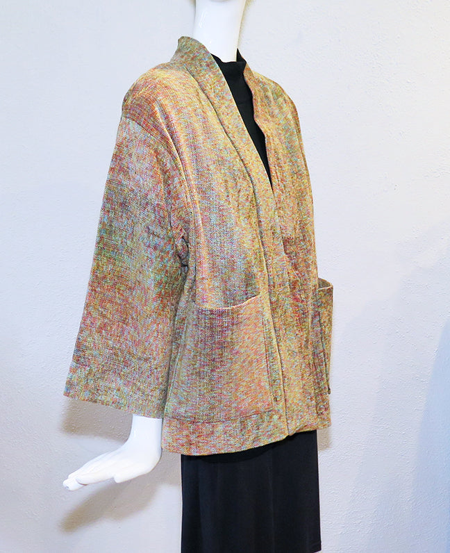 Elizabeth Jenkins has been creating handwoven apparel for women in Taos since 1978. Her palette of fibers in silk, cotton, rayon, wool and mohair is brilliant. Her styles are contemporary, with influences from indigenous cultures around the world. Please inquire if you see something you like but need a different size or color.