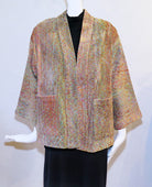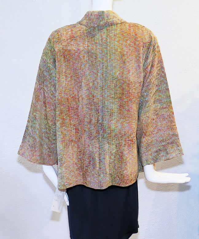 The versatile kimono jacket is a new favorite with fans of Elizabeth's handwovens. It's simply tailored with 3/4 length sleeves, a shawl collar and patch pockets. Cotton, silk and rayon blend. Great for smaller ladies, but flattering on a variety of body types. One size: 42" bust; 24" length