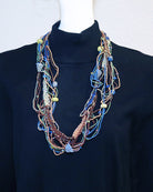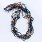 Esta Kirschner is an Albuquerque, NM artist and creates fabulous whimsical beaded jewelry. A lovely combination of lapis, olive opal and African beads with other gemstones. 24" long with button clasp.
