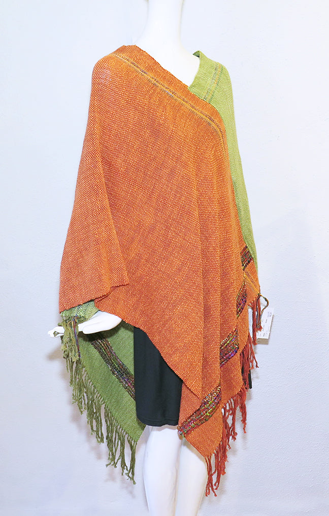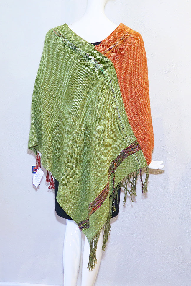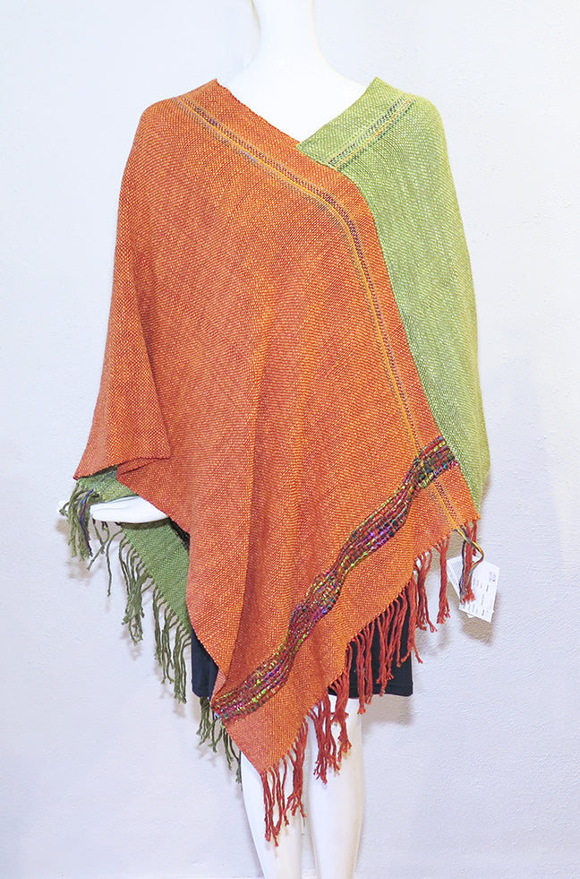 Fay started with us in the summer of 2014 and her scarves continue to be a hit with our customers. Her colorful ponchos are a welcome addition at Artemisia. Hand dyed woven cotton and silk accent fibers in contrasting colors for a versatile easy to wear lightweight reversible poncho. One size fits most.