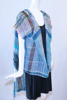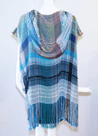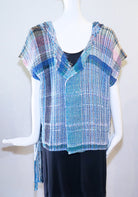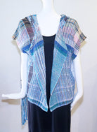 Dayna Fisk-Williams, owner of Fringe Weaving in Santa Fe, weaves beautiful freestyle fabrics using natural fibers, and fashions them into unique one-of-a-kind wearable art. This hooded vest is a lightweight handwoven cotton (60%) and bamboo (40%) fabric. It can be worn with the front open, like a vest, or use the shawl pin to close it like a jacket. Fun hi-lo styling and playful hood. Size L-XL; 44" bust with front closed; 23" length in front; 34" length in back, including fringe.