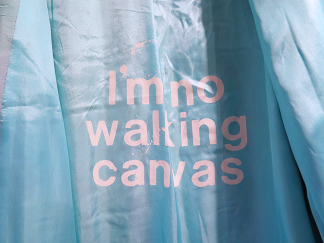 One-of-a-kind wearable art coat by renowned artist and designer, Carole Waller. This 80's style raw silk coat is handpainted front and back and is fully lined. The label is "I’m no walking Canvas". Oversized style with front lapel, long sleeves, side seam pockets, and double button closure. One size: 50" bust; 48" length; Pre-Owned