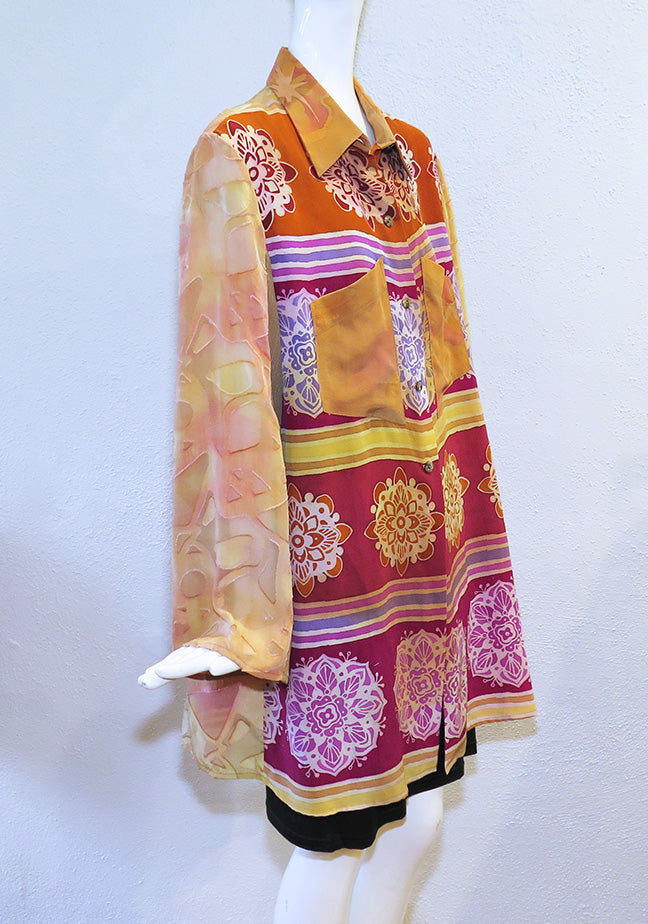 This lovely blouse is 100% silk, with a shirt style collar, long sleeves, and button front. Tunic length. Wear it as a blouse or tunic or open as a jacket. One size - 40" bust; 32" length. Pre-Owned