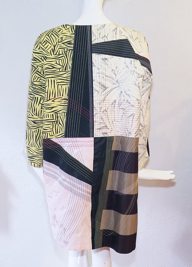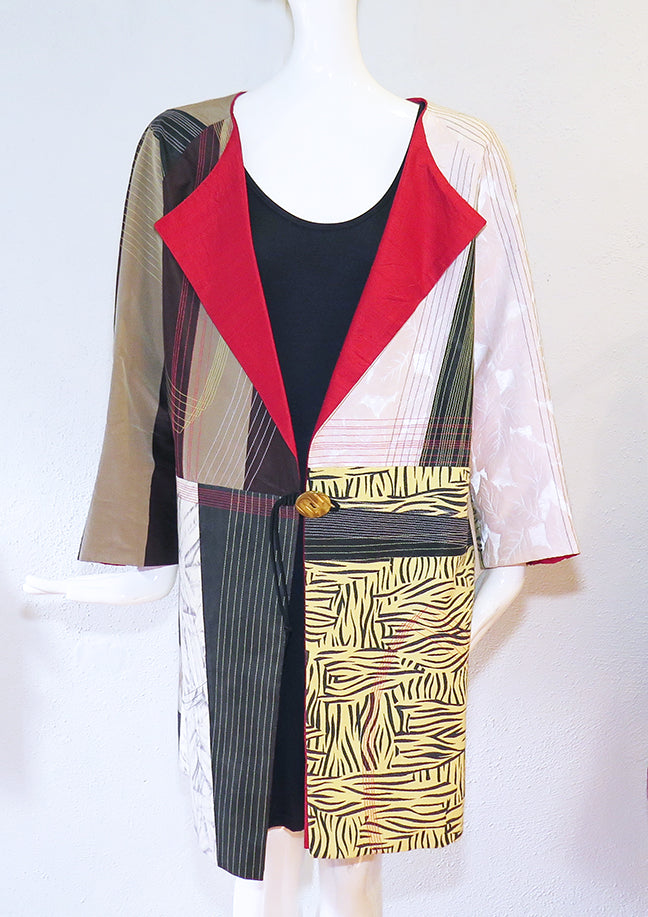 Starr Hagenbring is a rockstar in the wearable art world. In this fabulous one-of-a-kind jacket, she has combined bold patterns from vintage fabrics and contrast stitching to form layers of vibrant decoration. Fully lined in red raw silk, bracelet length sleeves and single button closure. Size M - 42" bust; 34" length. Gently used.
