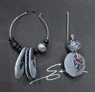 Gerri's asymmetrical polymer clay earrings are extremely popular at Artemisia! Fun, colorful lightweight clay designs that fit any style in silver, copper or black wire. Fish hook is 1/25" round and 2" long; dangle is .75" wide and 2" long
