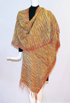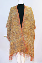 This beautiful new ruana is Ikat dyed silk, linen and fine merino with a contrasting selvedge. Lightweight but substantial handwoven fabric. Generously sized: 30" from top center to bottom V in back; 43" side length from center. 40% linen/30% merino/30% silk
