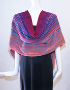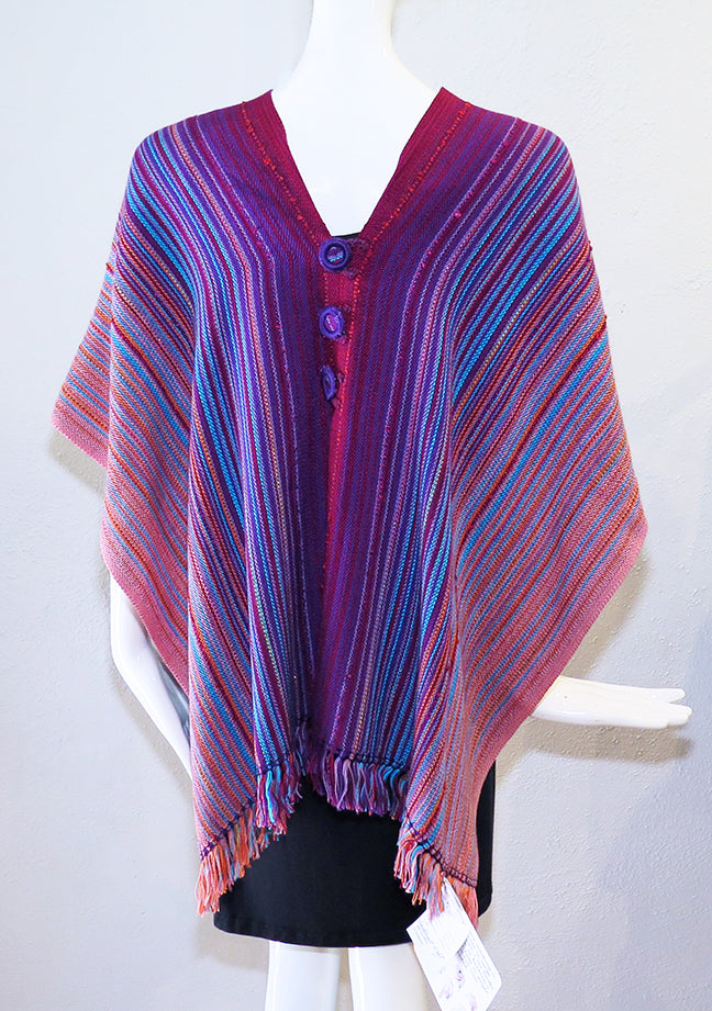 This handwoven original design was created by Randie Felts in Clarksville, Virginia. The "Carnival" Button Wrap is made from sustainable Tencel and cotton with hand painted rayon metallic and rayon loop for added sparkle and texture. The three handcrafted buttons and loops allow you to wear this piece multiple ways. Soft lightweight feel, elegant drape and easy care. One size: 16” wide x 80” long with 2” untwisted fringe. Illustrations for ways to wear and care instructions included.