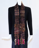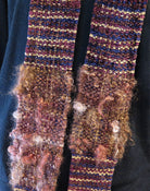 Sandra Doak likes to create new fabric techniques and explore the use of color with plain weave and twill. She lets the woven fabric dictate the wearable design when she creates her one-of-a-kind wearables. This scarf is a mix of chenille, copper matallic, and hand spun alpaca. Hand wash cool; hang to dry. Measures 3" wide x 64" long, including fringe