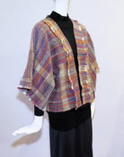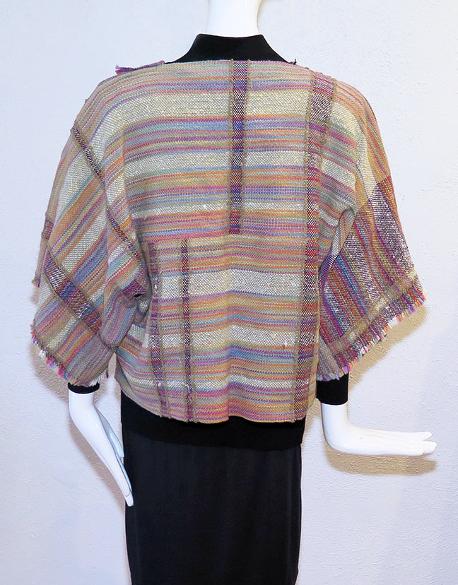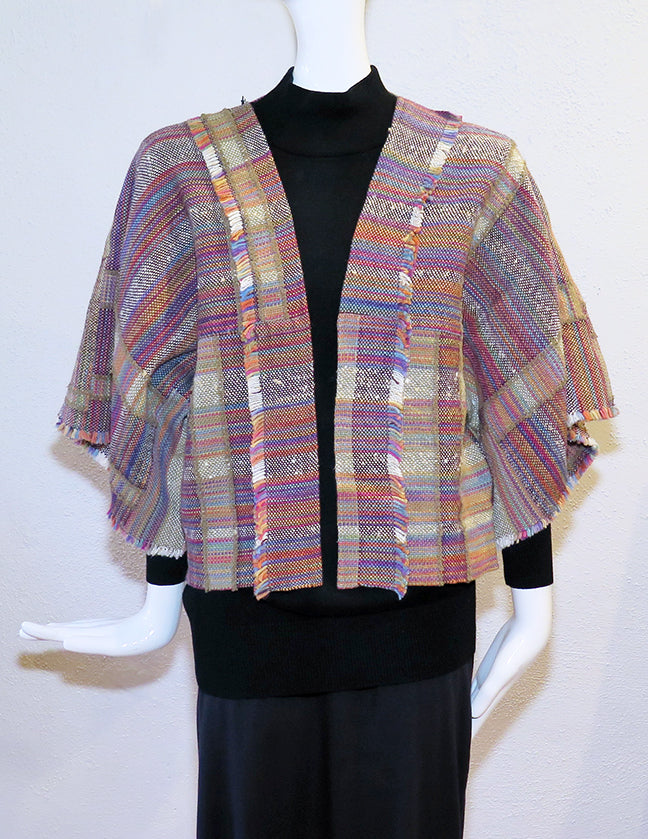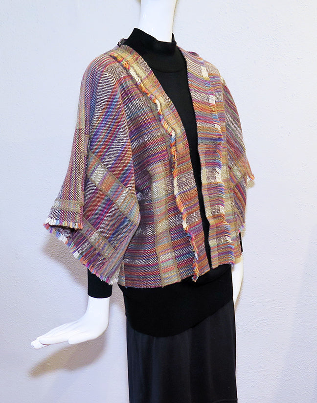 Sandra Doak likes to create new fabric techniques and explore the use of color with plain weave and twill in her one-of-a-kind creations. This sweet little jacket is 100% handwoven cotton, with a fringed shawl collar and kimono style sleeves in denim friendly colors. Hand wash cool; hang to dry. One size: 42" bust; 22" length.