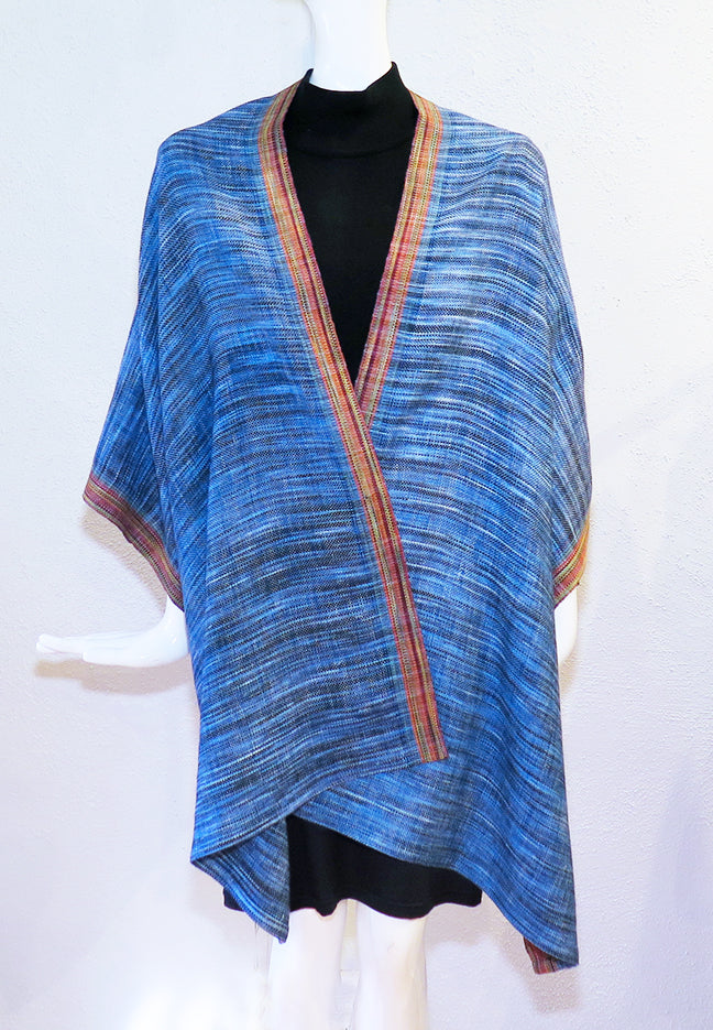 This beautiful new ruana is Ikat dyed silk, linen and merino with a contrasting selvedge. Lightweight but substantial handwoven fabric. Generously sized: 30" from top center to bottom V in back; 34" side length from center. 40% linen/30% merino/30% silk
