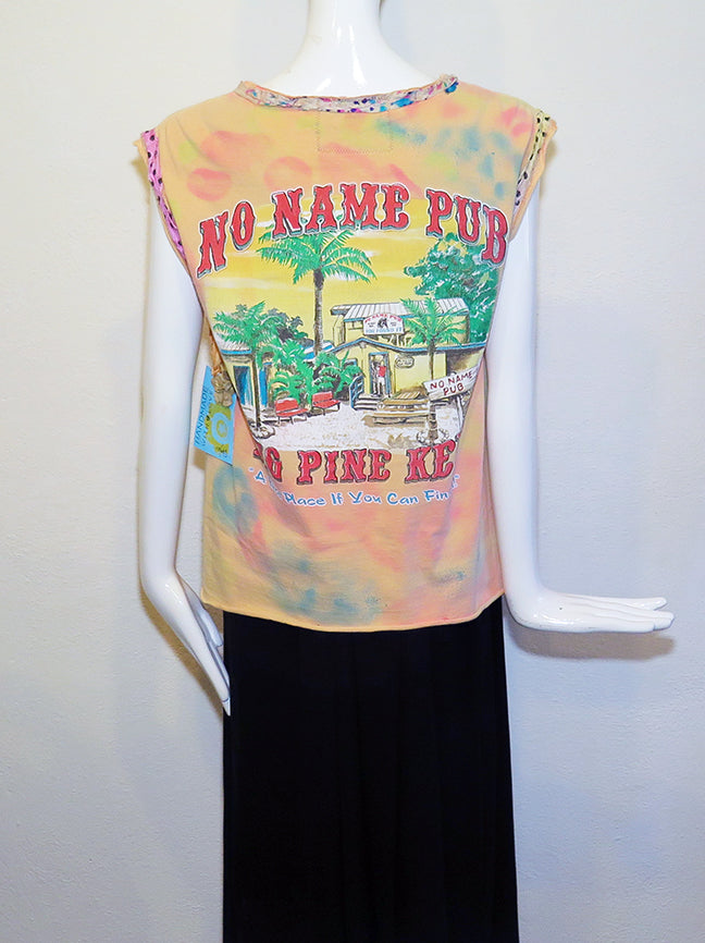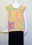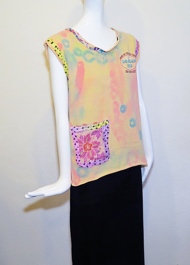 Kathy Skomsky (formerly of Sylvia's Couture) is making wearable art again! Her upcycled "No Name Pub" cropped tee is part of the new Altered Eco Collection. This handmade one-of-a-kind upcycled fun and funky sleeveless tee uses a mixture of hand-dyed cotton fabrics, fun embellishments front and back, a single patch pocket, and raw edges • Size XS/S - 36" bust; 22" overall length