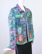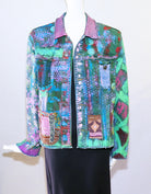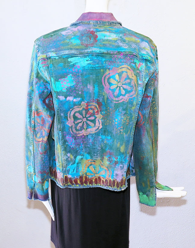 Kathy's "Ravenna Dreams" painted denim jacket is part of her Altered Eco Collection. This one-of-a-kind jacket is made from a thrifted denim jacket and has been painted all over by Kat. It features fun patch pockets, cotton embellishments, and button front. Size XS/S - 38" bust; 21" length